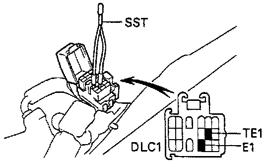 - Using a jumper wire (or SST 09843 - 18020), connect terminals TE1 and E1 of the DLC1.