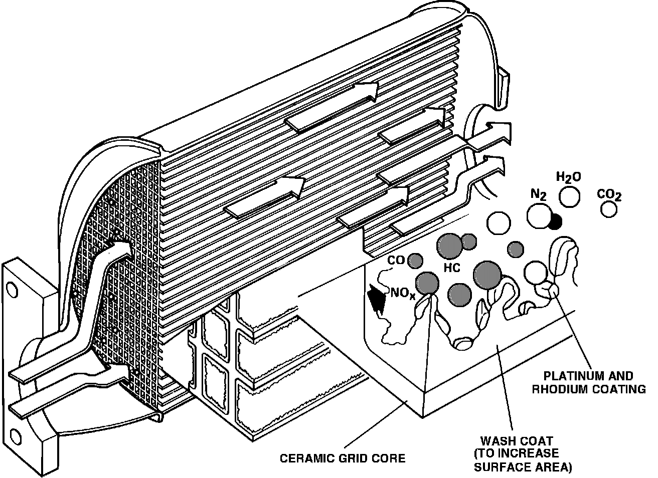As the exhaust gasses containing HC and CO pass through the converter in the presence of oxygen, the platinum catalyst starts the oxidation (burning) process. The HC and CO then unite with oxygen to form water vapor and carbon dioxide. This oxidation process has no effect on the NOx emissions.
