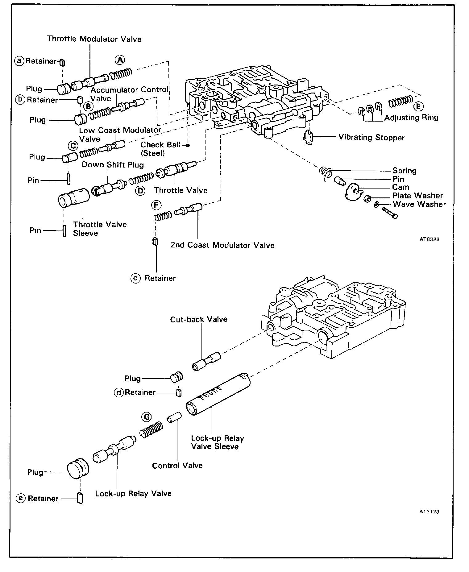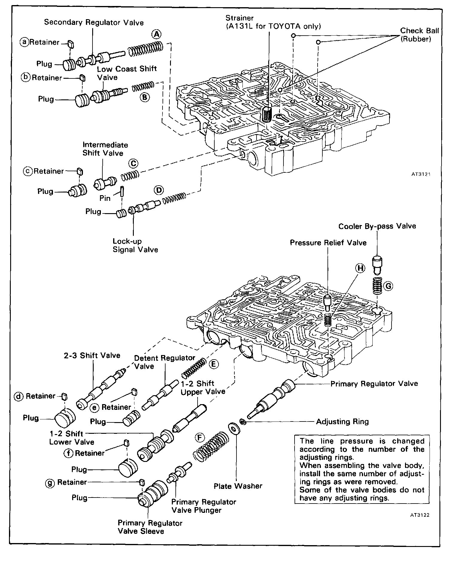 HINT: Count the number of adjusting rings before disassembly of the valve body because the throttle pressure is changed according to the number. (Some of the valve bodies do not have any adjusting rings.)