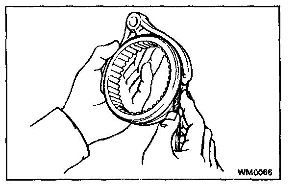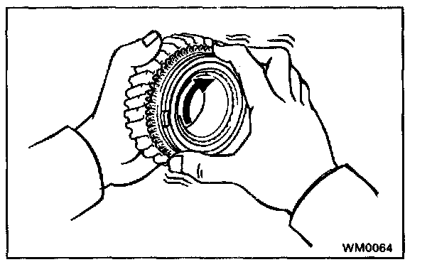 b. Check the braking effect of the synchronizer ring. Turn the synchronizer ring in one direction while pushing it to the gear cone. Check that the ring is locks If the braking effect is insufficient, apply a small amount of fine lapping compound between the synchronizer ring and gear cone.