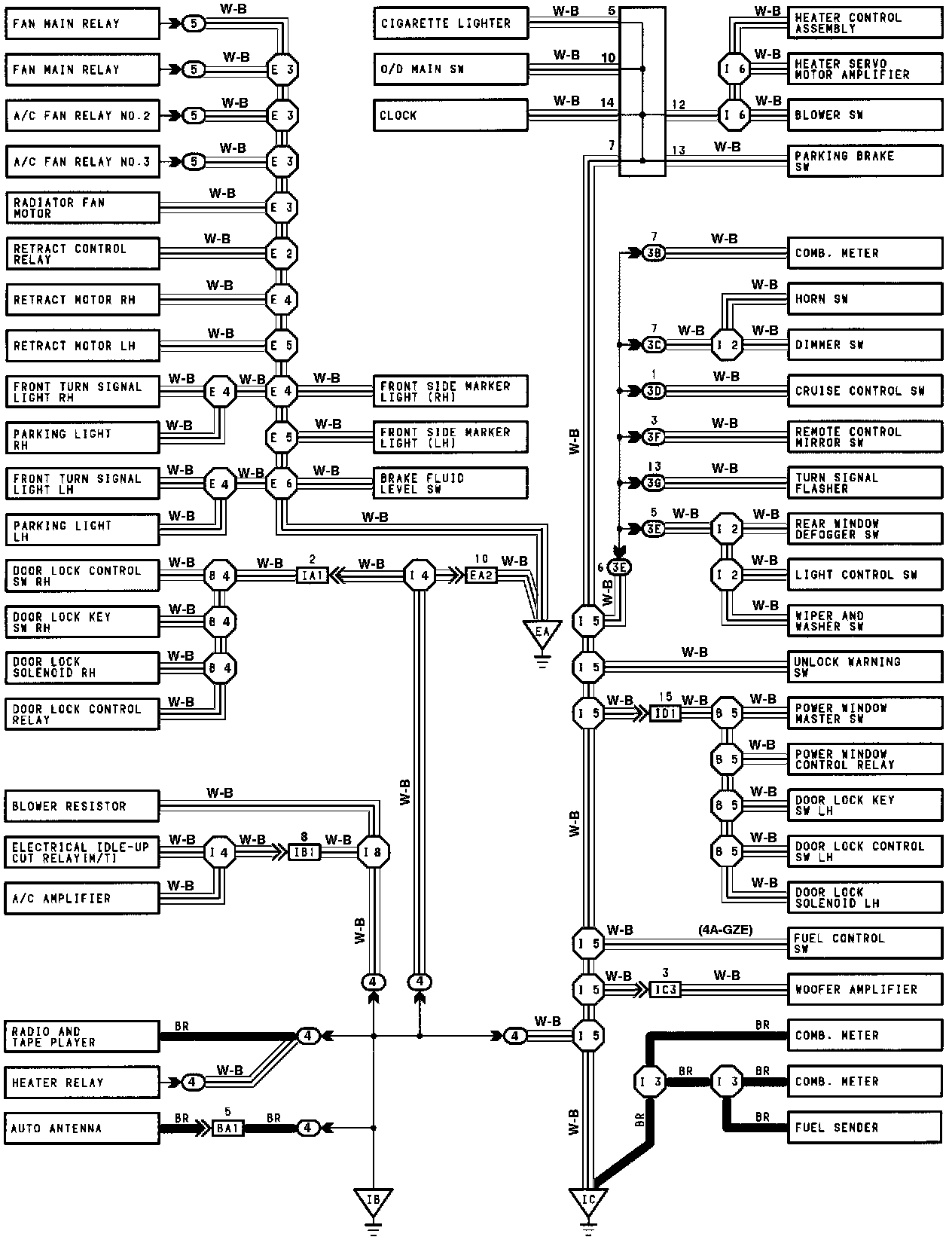 The ground points circuit diagram shows the connections from all major parts to the respective ground points. When troubleshooting a faulty ground point, checking the system circuits which use a common ground may help you identify the problem ground quickly. The relationship between ground points (EA, IB and IC shown below) can also be checked this way.