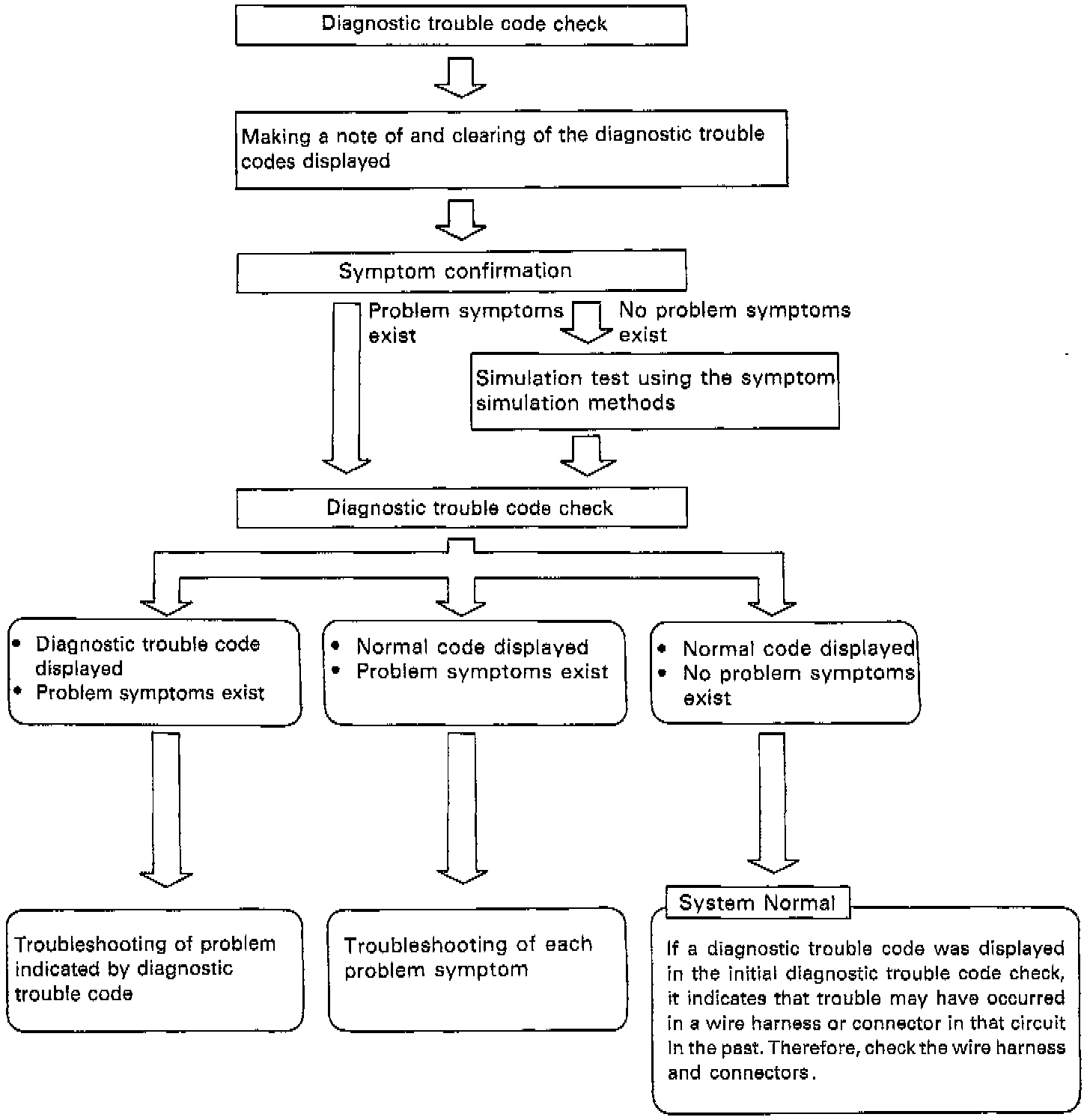 Taking into account the above points, a flow chart showing how to proceed with troubleshooting using the Diagnostic Trouble Code Check is shown below. This flow chart shows how to utilize the Diagnostic Trouble Code Check effectively, then by carefully checking the results, indicates how to proceed either to diagnostic trouble code troubleshooting or to troubleshooting of problem symptoms.