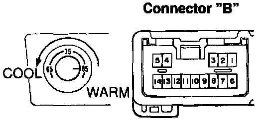 b. Gradually turn the temperature control dial from "WARM" side to "COO" side and check the resistance between terminals B-4 and B-5 increase from 0 to approx. 3.0 k Ohms.