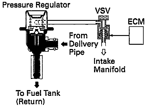 The ECM turns on a VSV (Vacuum Switching Valve) to draw the air into the diaphragm chamber of the pressure regulator if it detects that the temperature of the engine coolant is too high during engine starting.