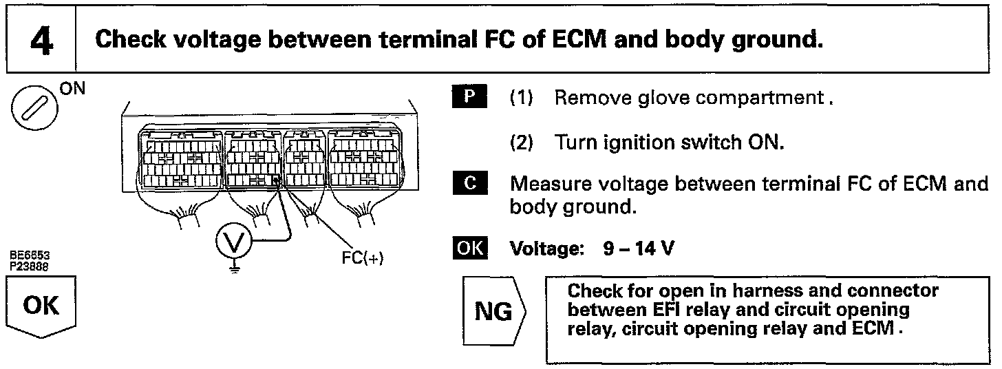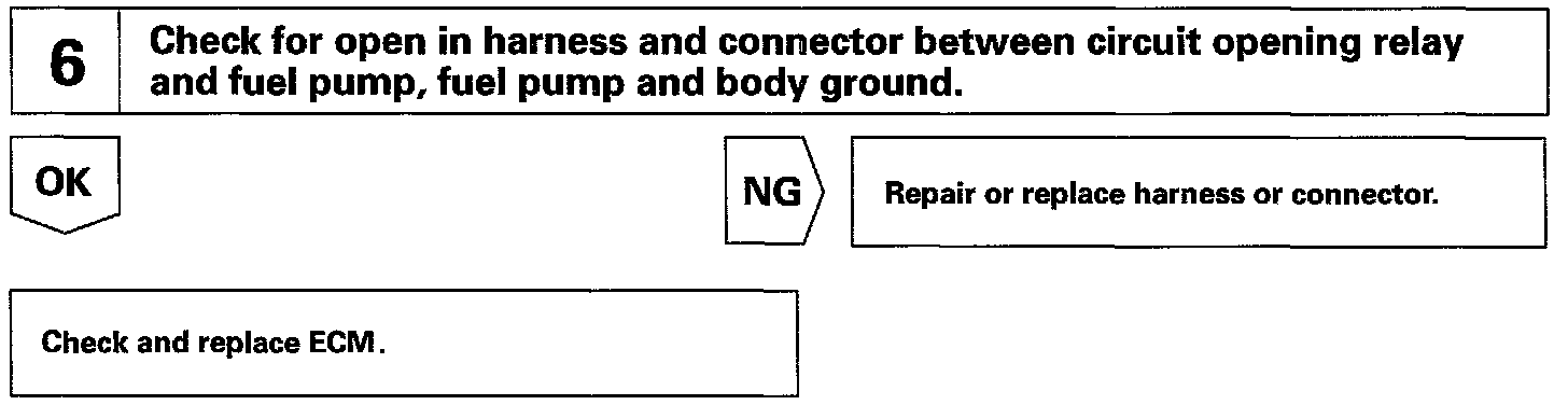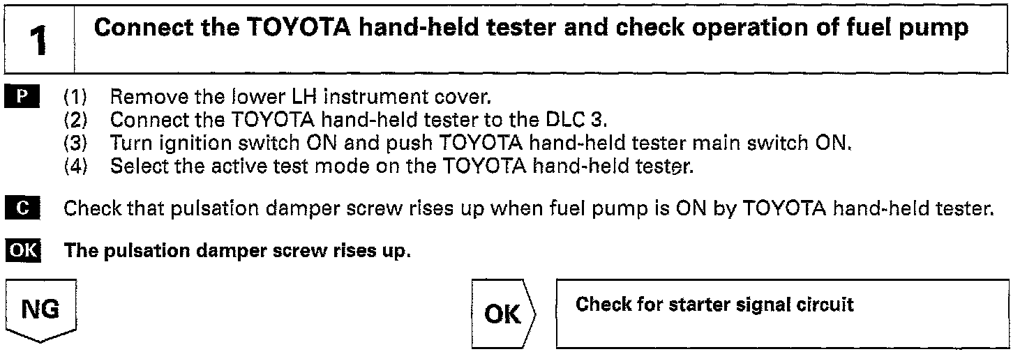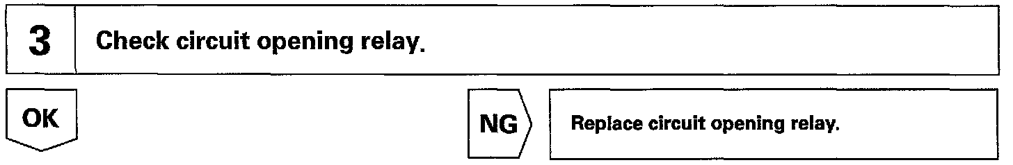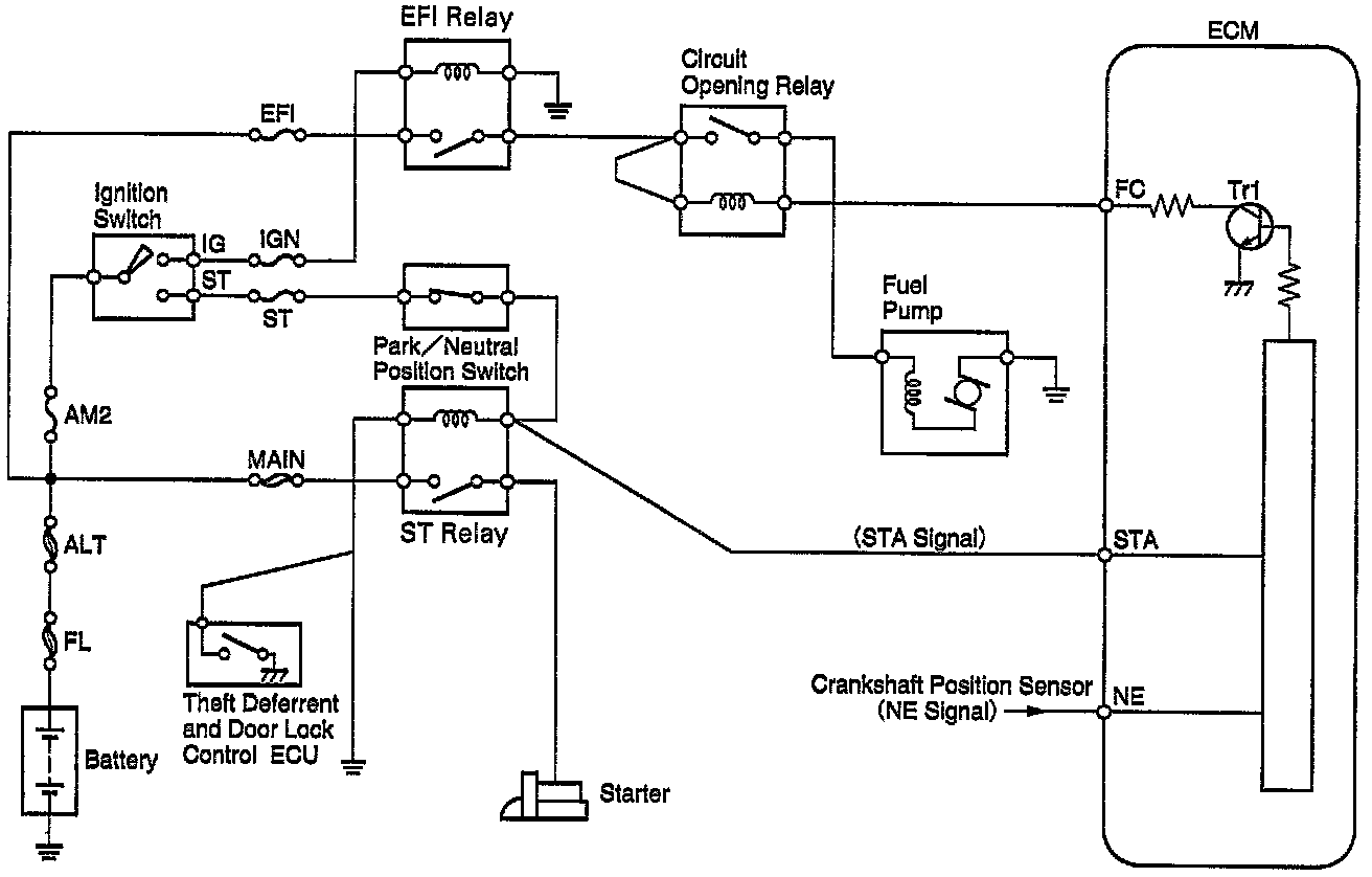 When the STA signal and NE signal are input to the ECM, Tr1 is turned ON, current flows to coil of the circuit opening relay, the relay switches on, power is supplied to the fuel pump and the fuel pump operates. While the NE signal is generated (engine running), the ECM keeps Tr1 ON (circuit opening relay ON) and the fuel pump also keeps operating.
