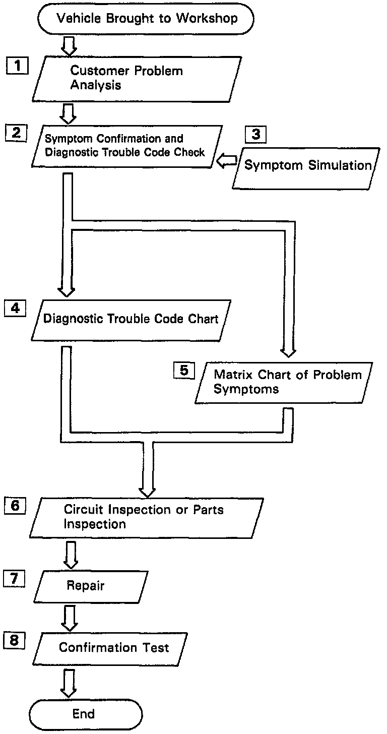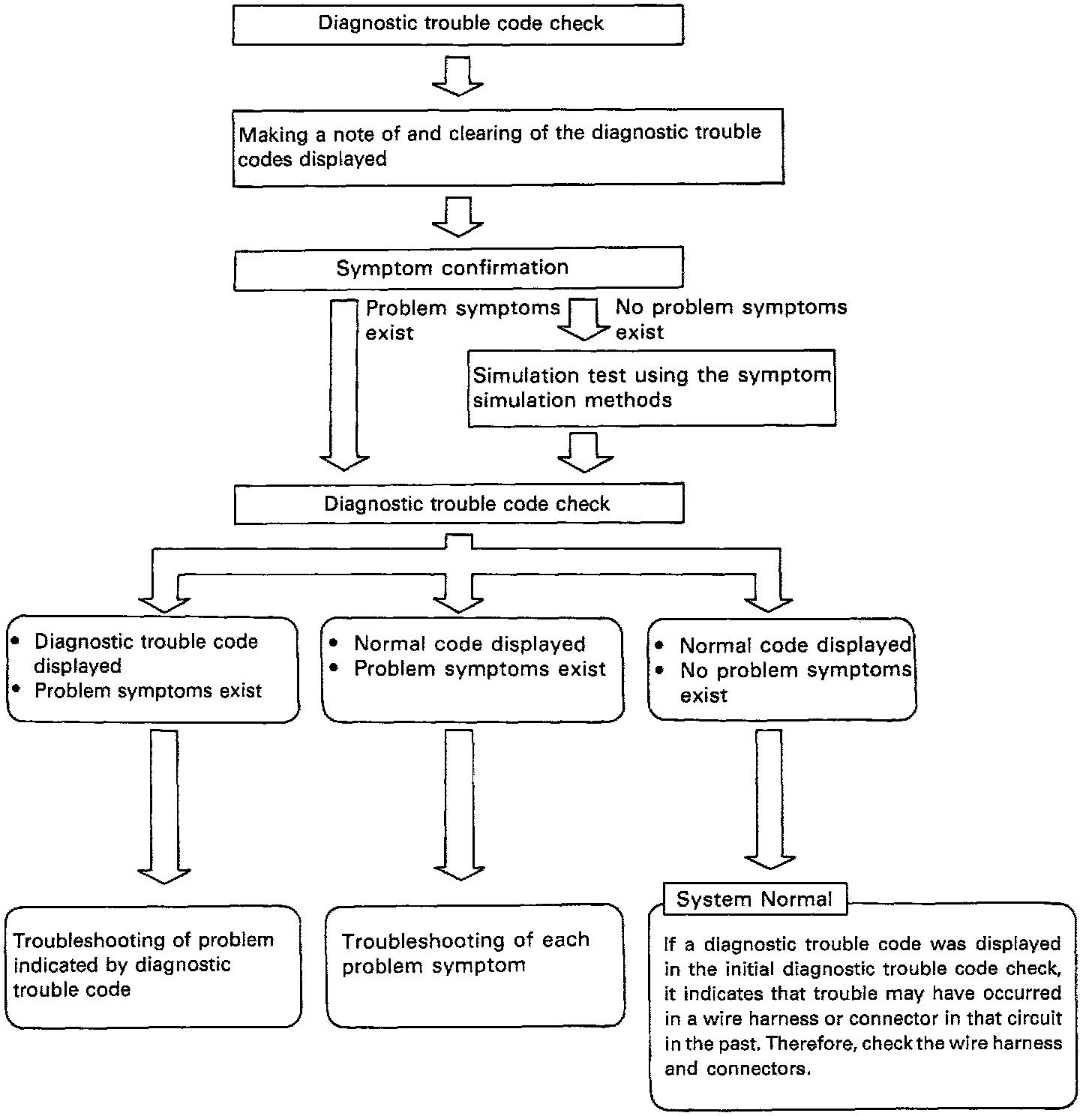 Taking into account the above points, a flow chart showing how to proceed with troubleshooting using the diagnostic trouble code check is shown below This flow chart shows how to utilize the diagnostic trouble code check effectively, then by carefully checking the results, indicates how to proceed either to diagnostic trouble code troubleshooting or to troubleshooting of problem symptoms.