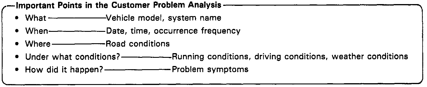 In troubleshooting, the problem symptoms must be confirmed accurately and all preconceptions must be cleared away in order to give an accurate judgement. To ascertain just what the problem symptoms are, it is extremely important to ask the customer about the problem and the conditions at the time it occurred.
