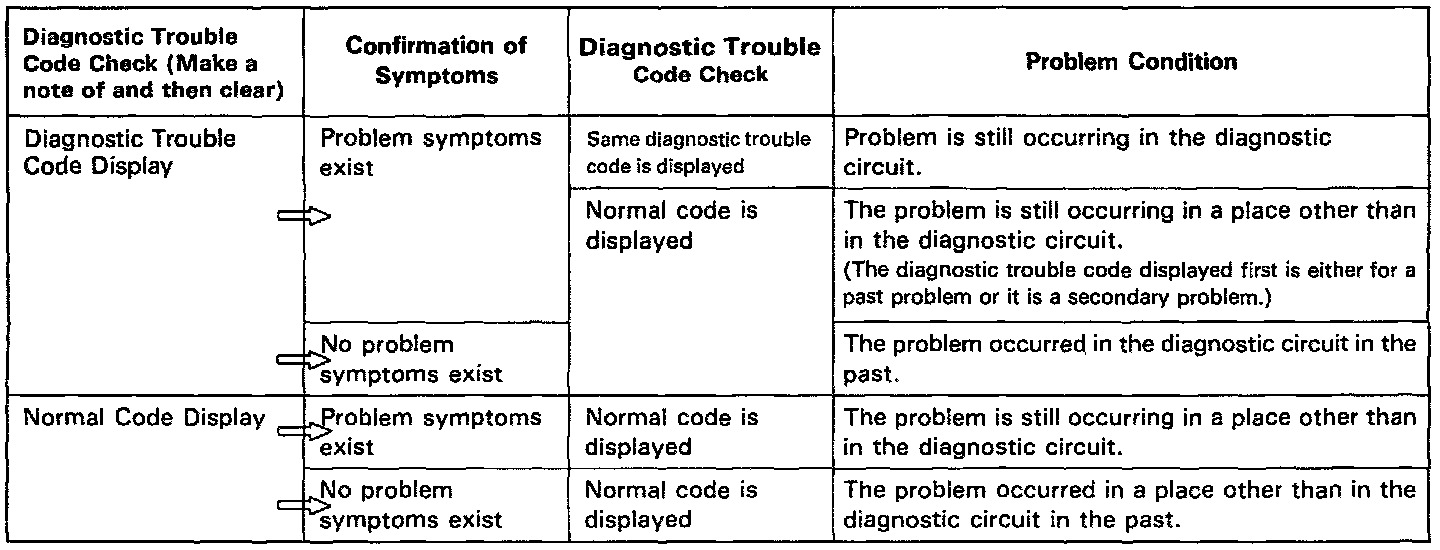 In diagnostic trouble code check, it is very important to determine whether the problem indicated by the diagnostic trouble code is still occurring or occurred in the past but returned to normal at present. In addition, it must be checked in the problem symptom check whether the malfunction indicated by the diagnostic trouble code is directly related to the problem symptom or not. For this reason, the diagnostic trouble codes should be checked before and after the symptom confirmation to determine the current conditions, as shown in the table below. If this is not done, it may result in unnecessary troubleshooting for normally operating systems, making it more difficult to locate the problem, or in repairs not pertinent to the problem. Therefore, always follow the procedure in correct order and perform the diagnostic trouble code check.