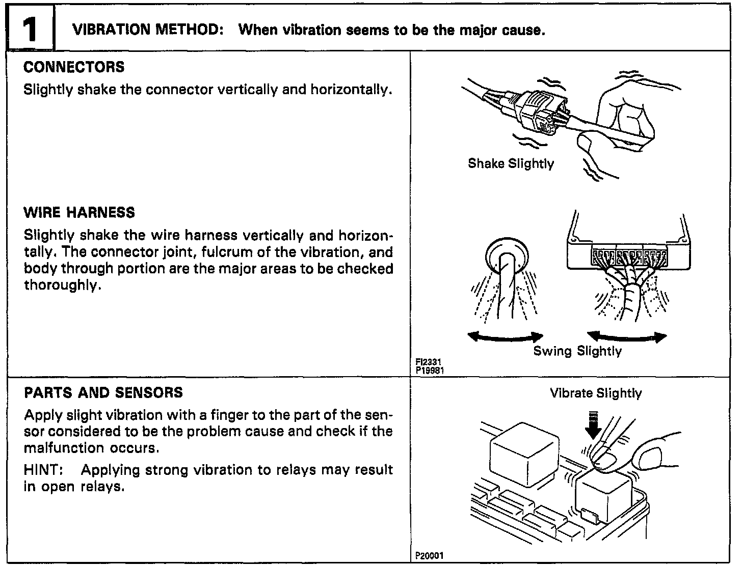 The most difficult case in troubleshooting is when there are no problem symptoms occurring. In such cases, a thorough customer problem analysis must be carried out, then simulate the same or similar conditions and environment in which the problem occurred in the customer's vehicle. No matter now much experience a technician has, or how skilled he may be, if he proceeds to troubleshoot without confirming the problem symptoms he will tend to overlook something important in the repair operation and make a wrong guess somewhere, which will only lead to a standstill. For example, for a problem which only occurs when the engine is cold, or for a problem which occurs due to vibration caused by the road during driving, etc., the problem can never be determined so long as the symptoms are confirmed with the engine hot condition or the vehicle at a standstill. Since vibration, heat or water penetration (moisture) are likely causes for problems which are difficult to reproduce, the symptom simulation tests introduced here are effective measures in that the external causes are applied to the vehicle in a stopped condition.