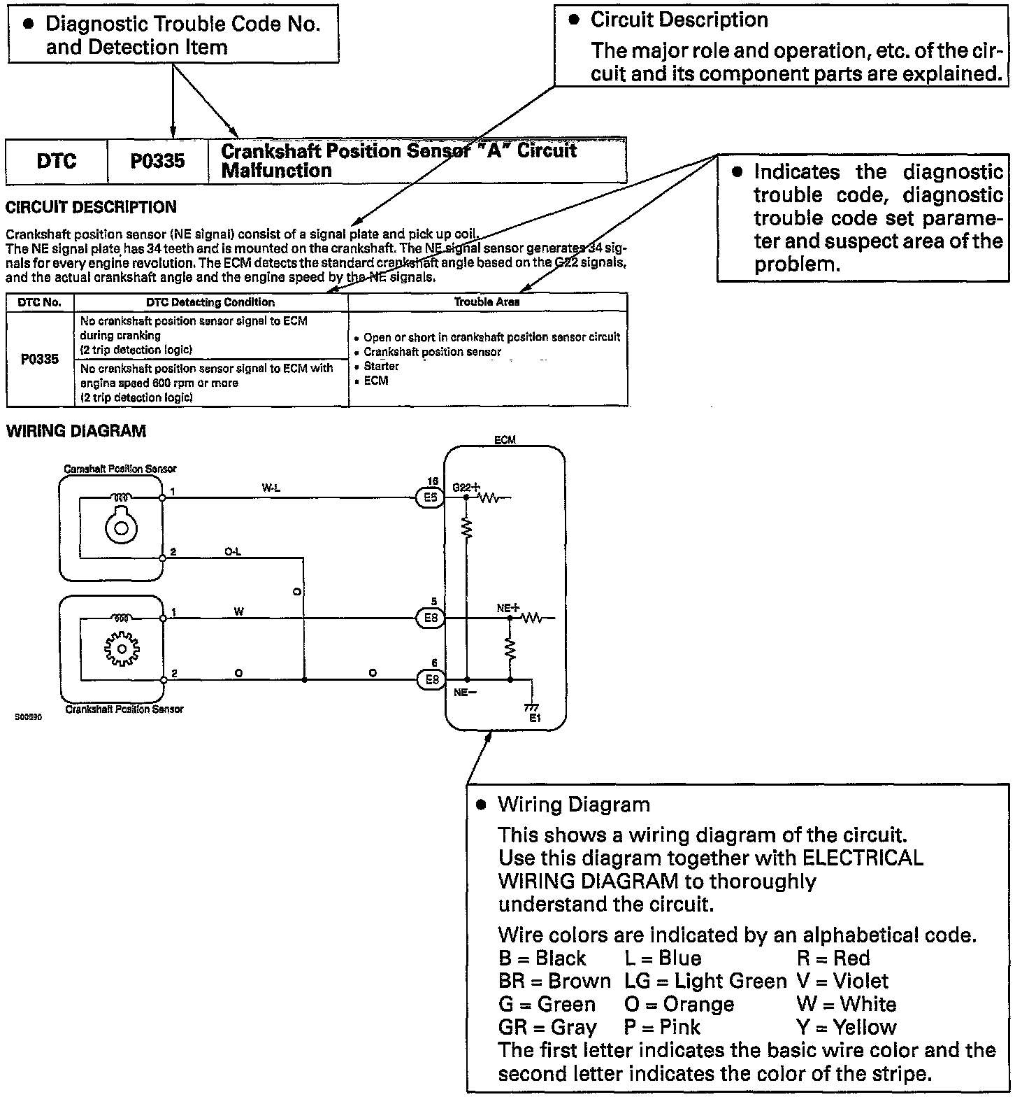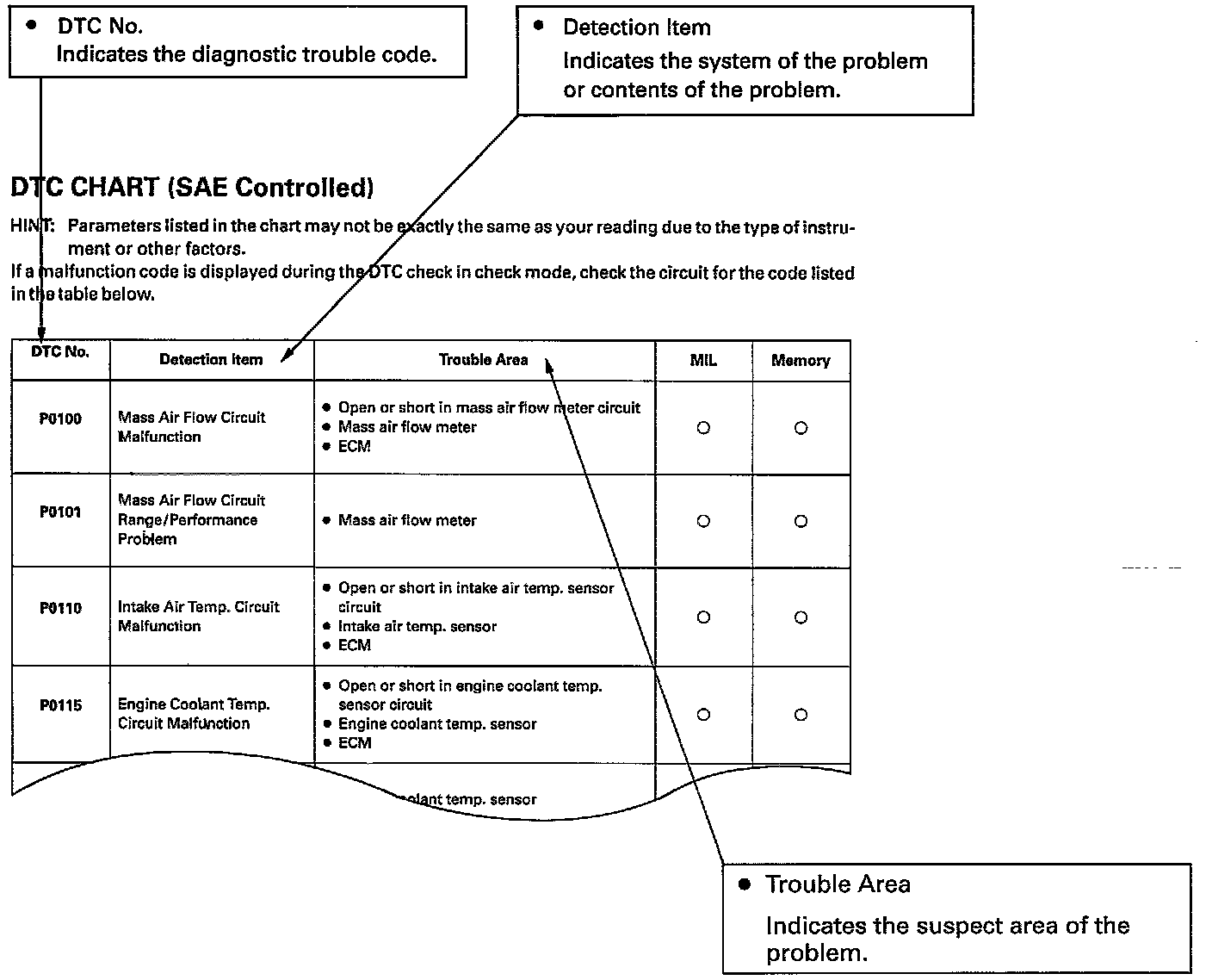 An example of the engine diagnostic trouble code chart is shown above. This chart permits efficient and accurate troubleshooting using the diagnostic trouble codes displayed in the diagnostic trouble code check. Proceed with troubleshooting in accordance with the inspection procedure given in the diagnostic chart corresponding to the diagnostic trouble codes displayed.