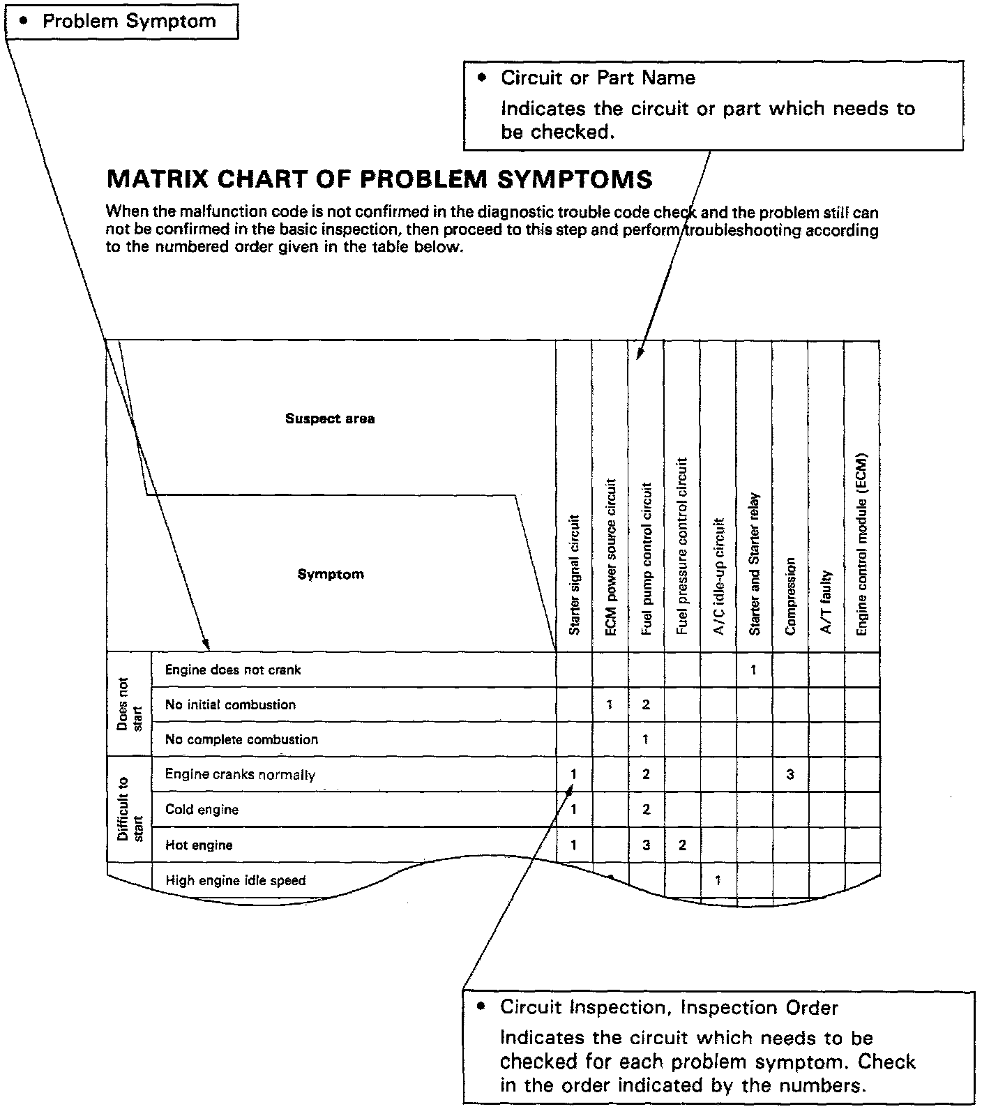 The suspect circuits or parts for each problem symptom are shown in the table above. Use this table to troubleshooting the problem when a "Normal" code is displayed in the diagnostic trouble code check but the problem is still occurring. Numbers in the table indicate the inspection order in which the circuits or parts should be checked.