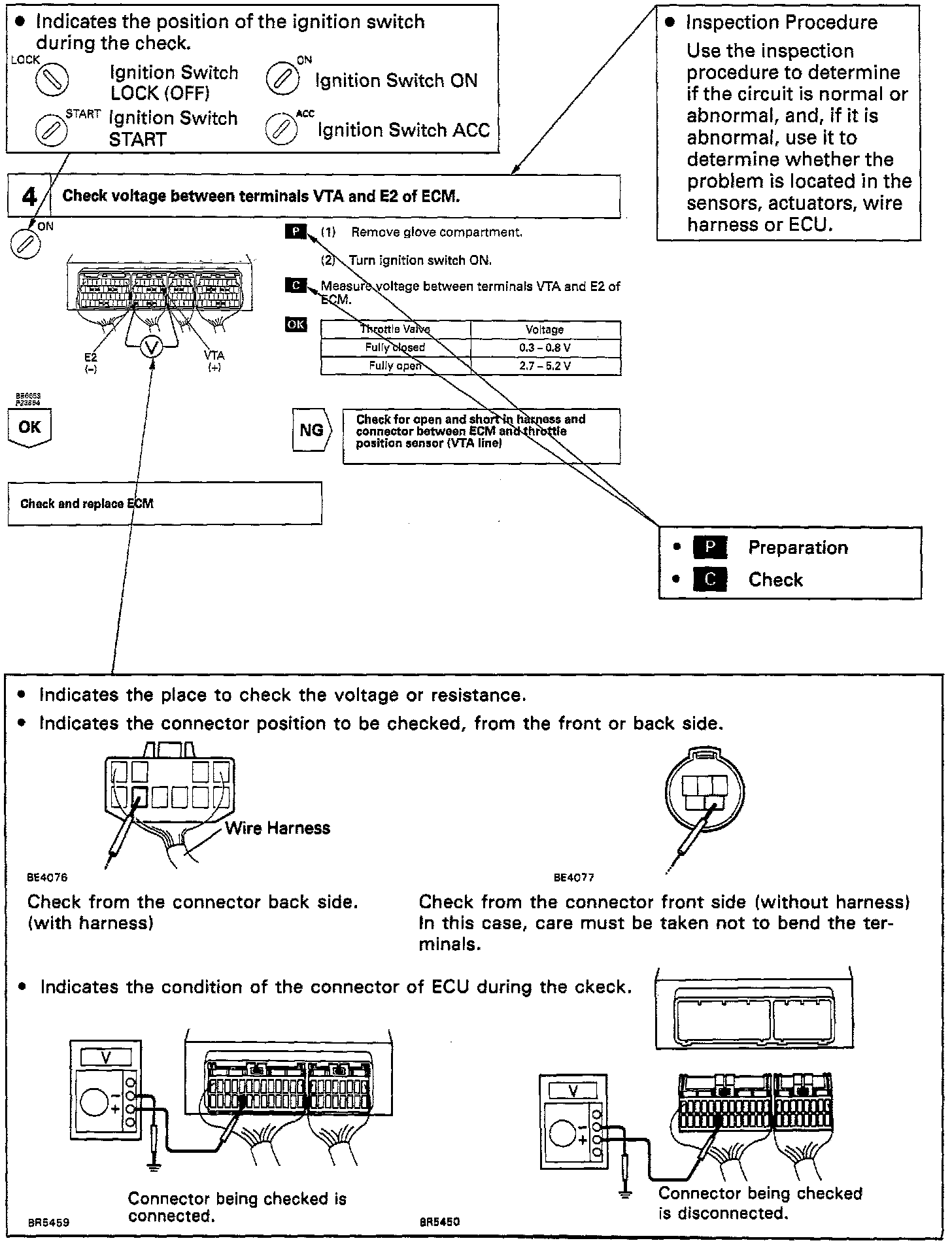 In the symptom simulation test, the problem symptoms should of course be confirmed, but the problem area or parts must also be found out. To do this, narrow down the possible problem circuits according to the symptoms before starting this test and connect a tester beforehand. After that, carry out the symptom simulation test, judging whether the circuit being tested is defective or normal and also confirming the problem symptoms at the same time. Refer to the matrix chart of problem symptoms for each system to narrow down the possible causes of the symptom.