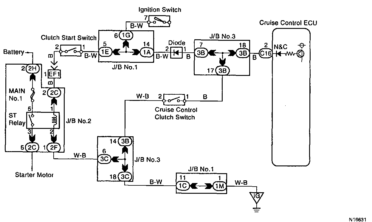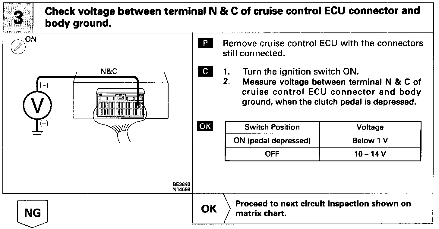 When the clutch pedal is depressed, the clutch switch sends a signal to the ECU, when this signal is input to the ECU during cruise control driving, the ECU cancels cruise control.