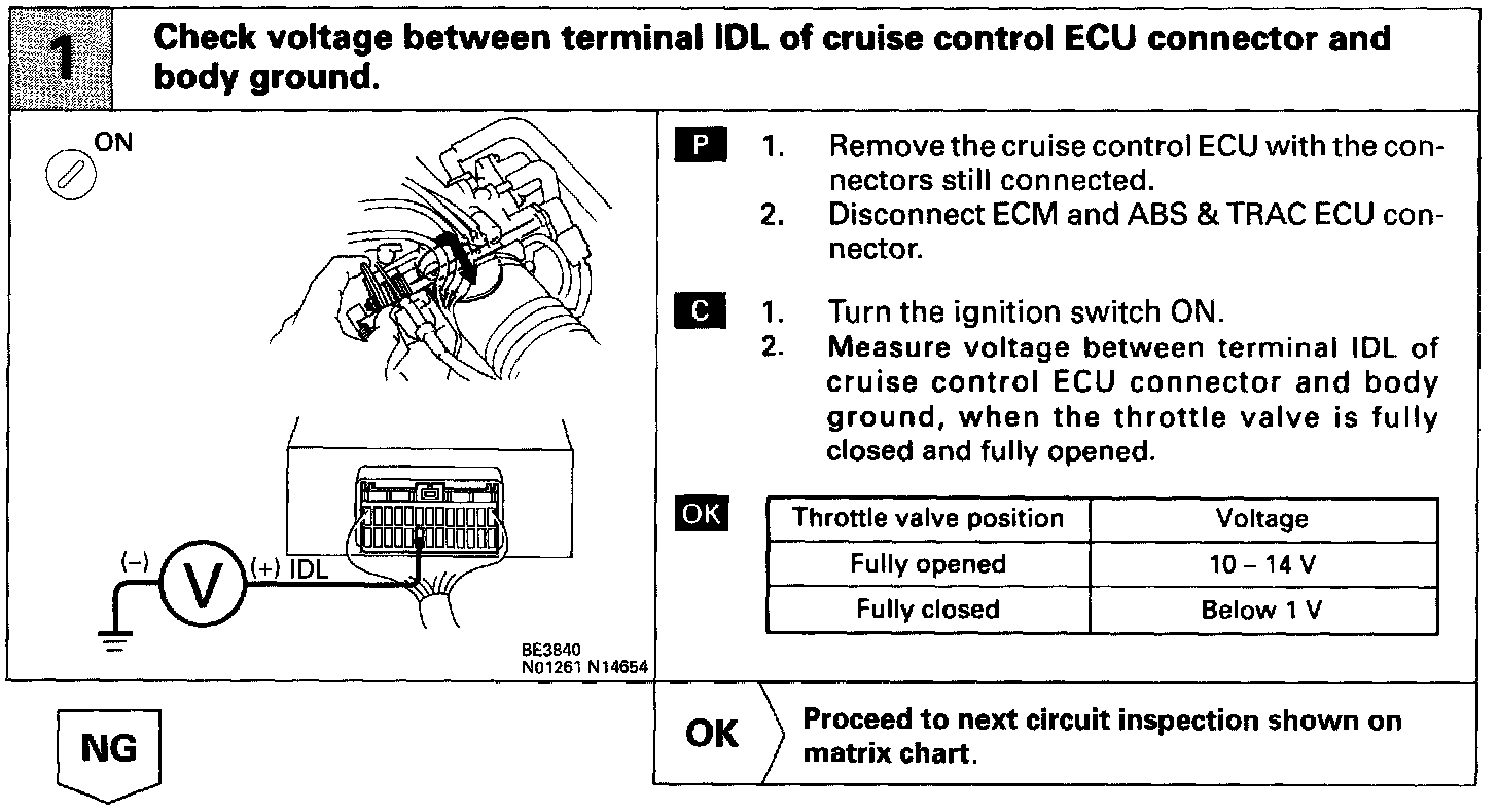 When the idle switch is turned ON, a signal is sent to the ECU. The ECU uses this signal to enable accurate cruise control at the set speed quickly. If the idle switch is malfunctioning, problem symptoms also occur in the engine, so also inspect the engine.