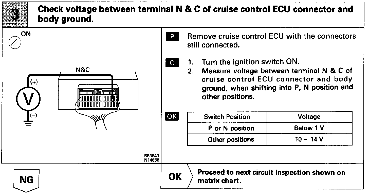 When the shift position is put in P or N, a signal is sent from the park/neutral position switch to the ECU. When this signal is input during cruise control driving, the ECU cancels the cruise control.