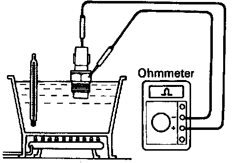 (1) Using an ohmmeter, check that there is no continuity between the terminals when the coolant temperature is above 98°C (208°F).