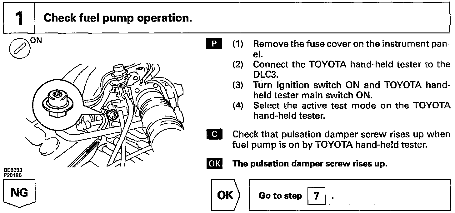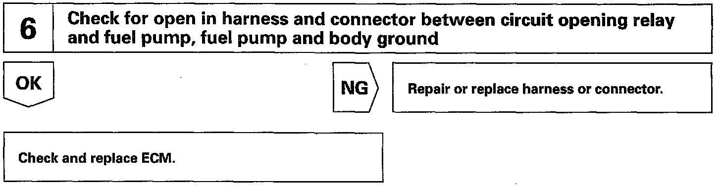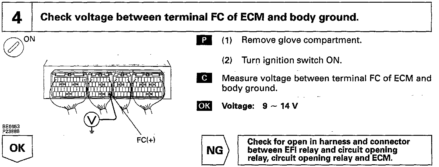 The fuel pump is switched ON (low voltage at terminal FC) when STA is on or while the NE signal is input to the ECM.