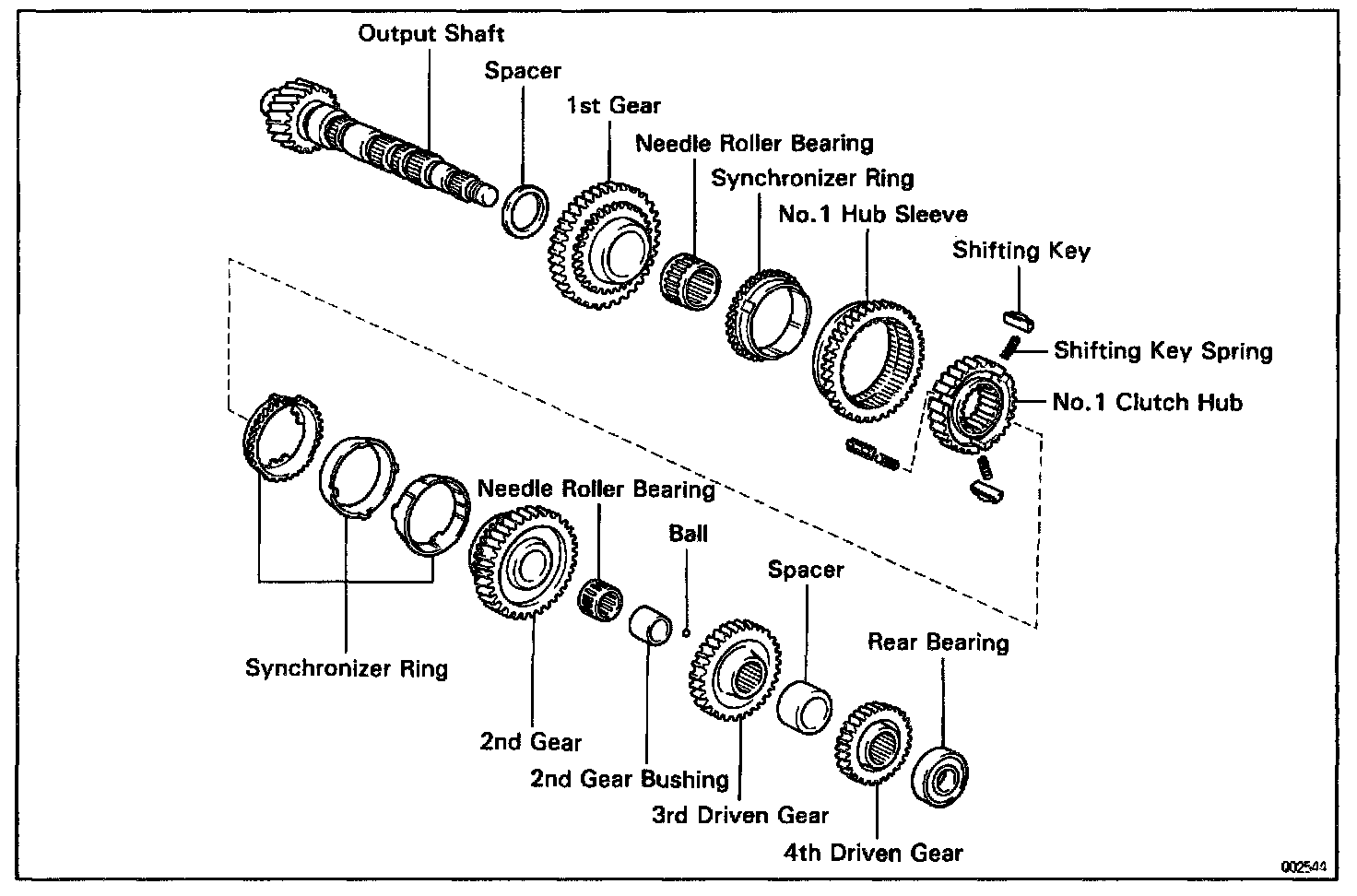 3. REMOVE REAR BALL BEARING, 4TH DRIVEN GEAR AND OUTPUT GEAR SPACER