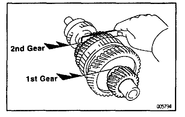 c. Using a feeler gauge, measure the clearance between the synchronizer ring back and gear spline end.