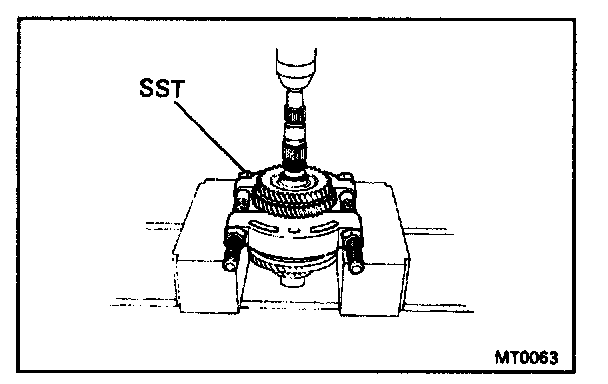 a. Using SST and a press, remove the rear ball bearing and 4th driven gear.