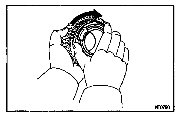 b. Check the braking effect of the synchronizer ring. Turn the synchronizer ring in one direction while pushing it to the gear cone. Check that the ring rocks. If the braking effect is insufficient, replace the synchronizer ring.