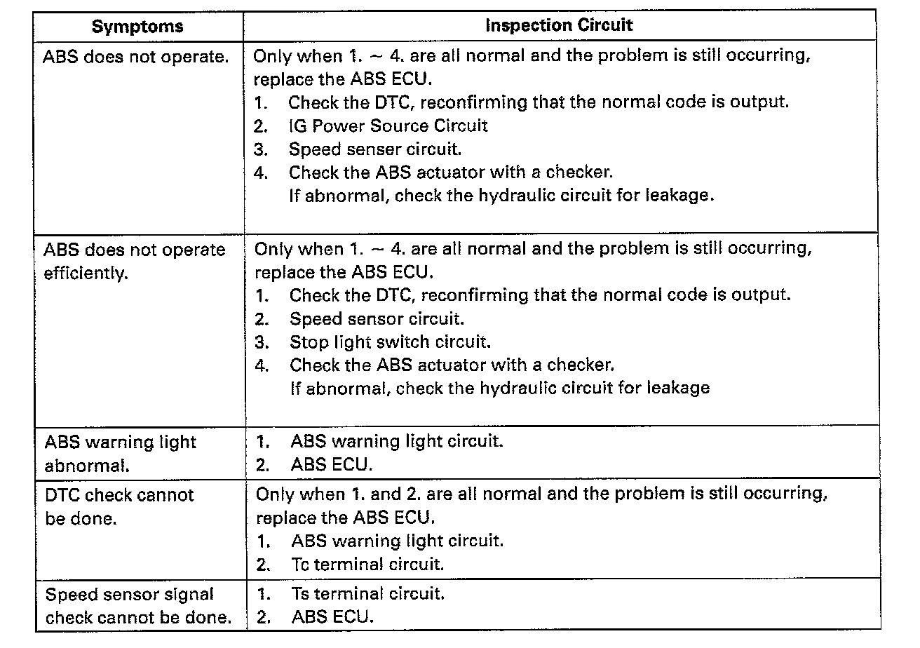 If a normal code is displayed during the DTC check but the problem still occurs, check the circuits for each problem symptom in the order given in the table below and proceed to the relevant page for trouble shooting.