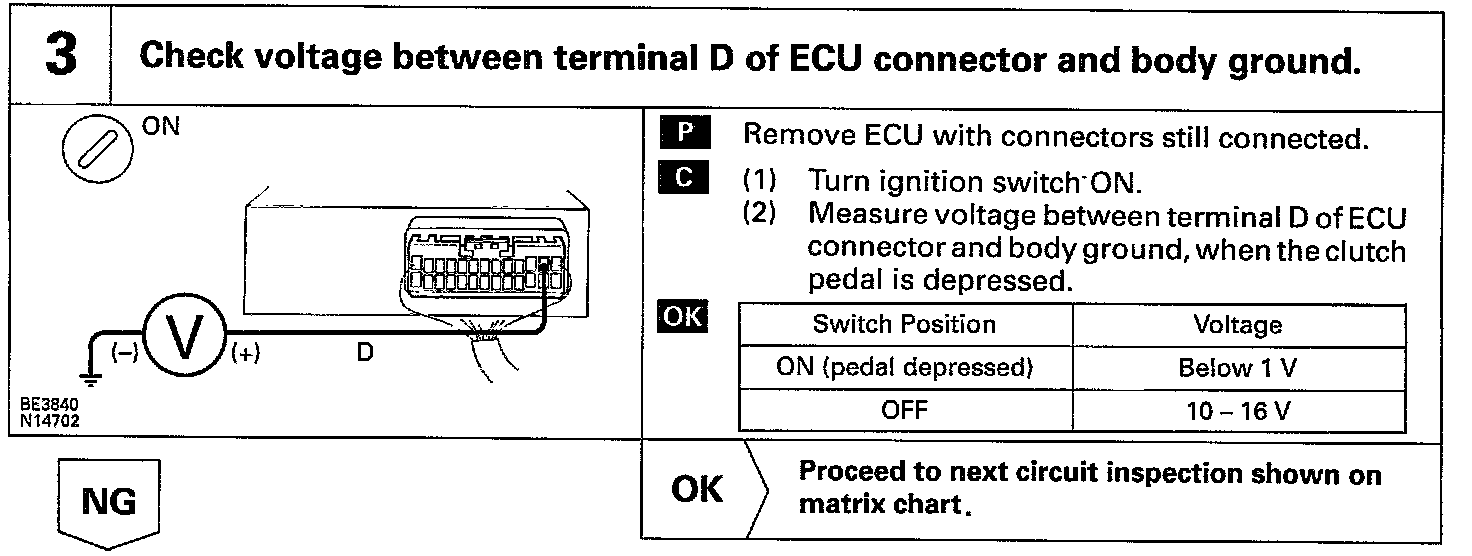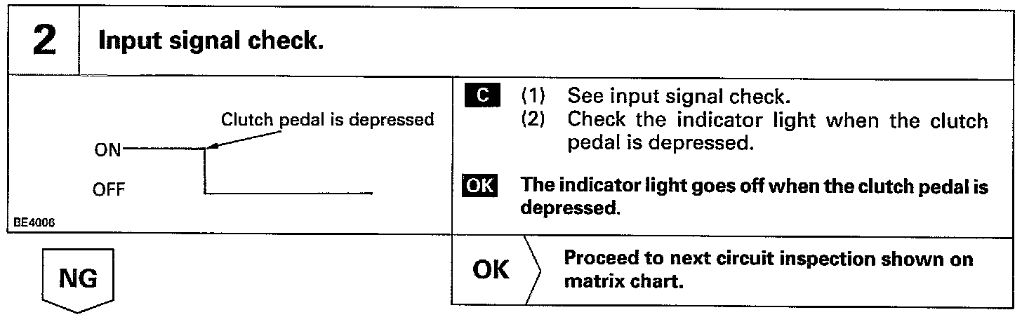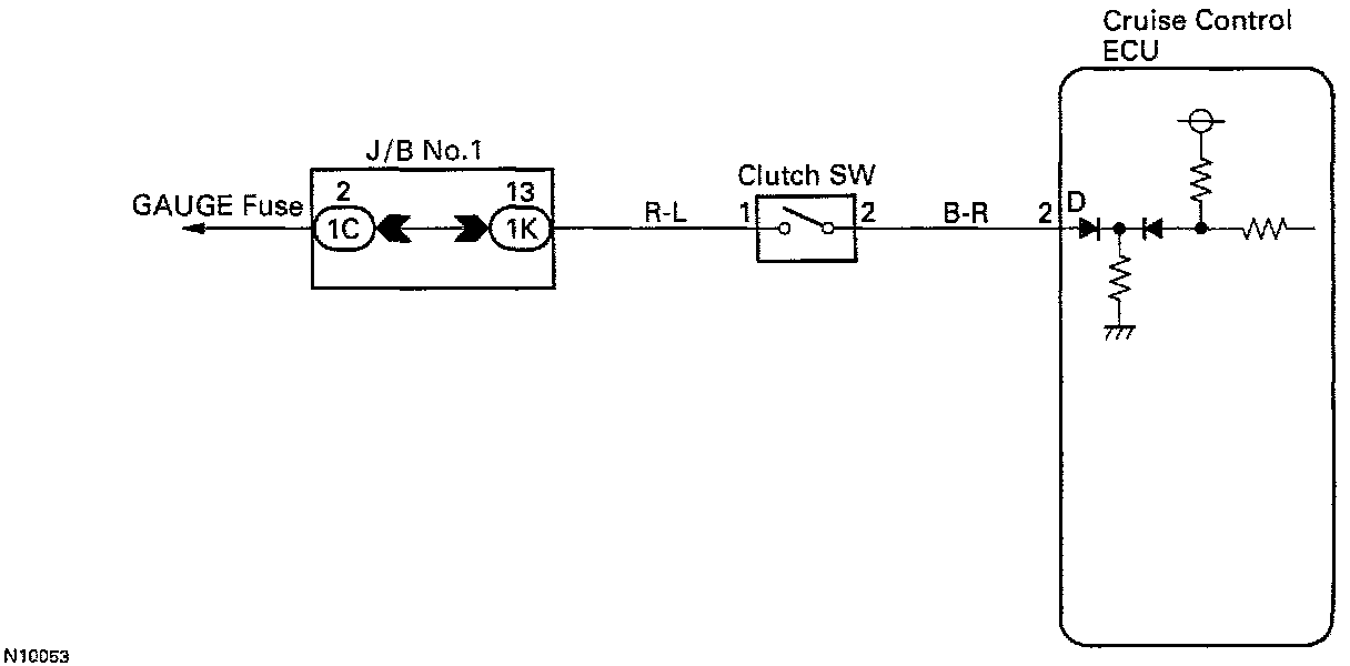 When the clutch pedal is depressed, the clutch switch sends a signal to the cruise control ECU, when this signal is input to the cruise control ECU during cruise control driving, the cruise control ECU cancels cruise control.
