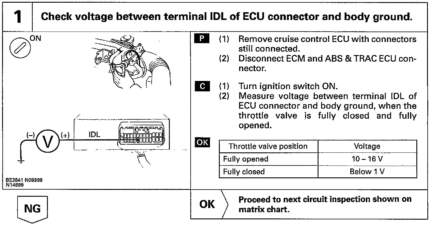 When the idle switch is turned ON, a signal is sent to the ECU. The ECU uses this signal to correct the discrepancy between the throttle valve position and the actuator position sensor value to enable accurate cruise control at the set speed. If the idle switch is malfunctioning, problem symptoms also occur in the engine, so also inspect the engine.