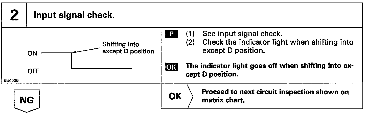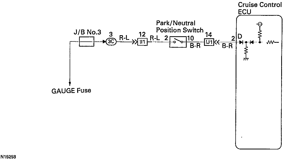 When the shift position is put in except D position, a signal is sent from the park/neutral position switch to the ECU. When this signal is input during cruise control driving, the ECU cancels the cruise control.