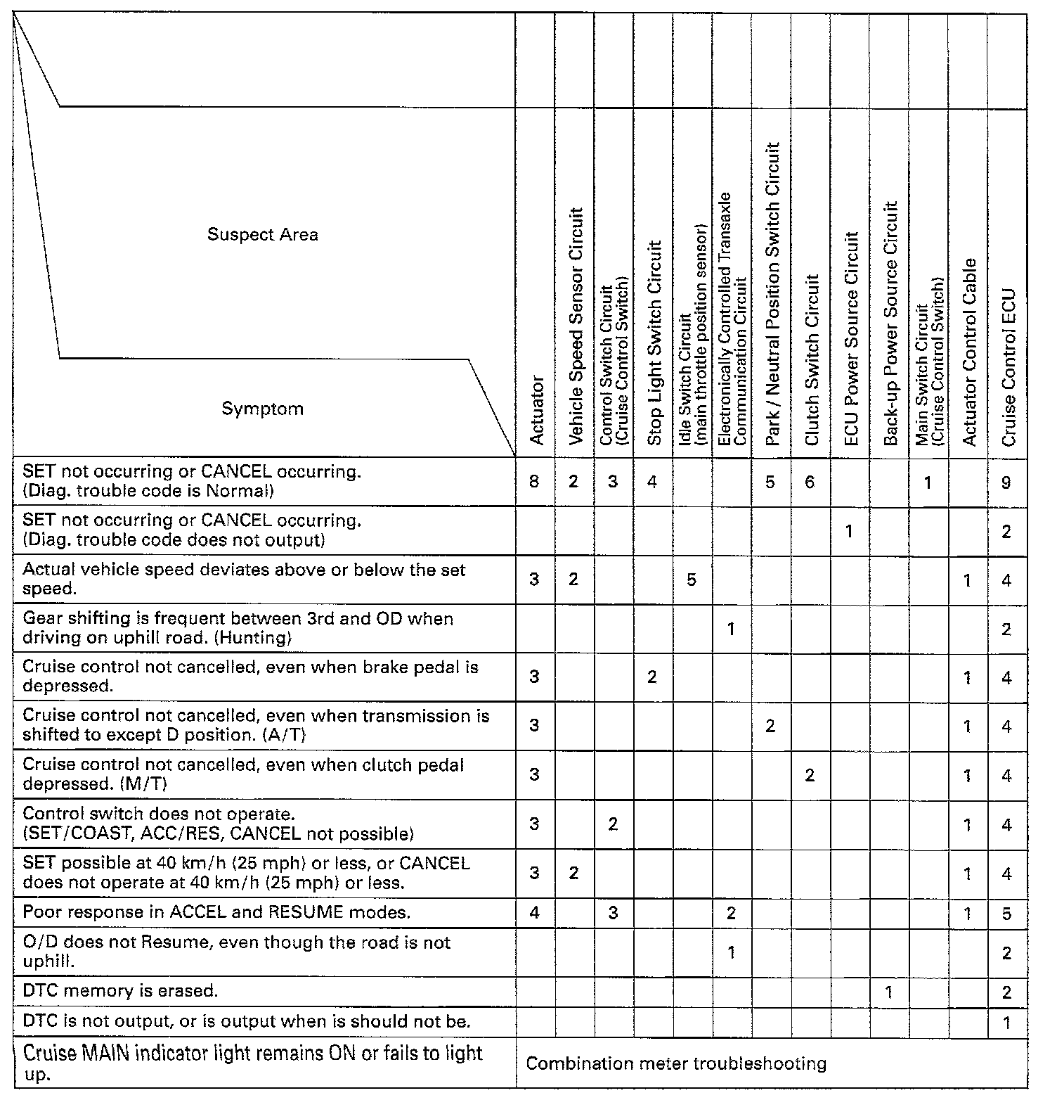 If a normal code is displayed during the diagnostic trouble code check but the trouble still occurs (reappears), troubleshoot for each problem symptom, checking the circuits for each symptom in the order given in the table below. Proceed to the page indicated for each circuit.