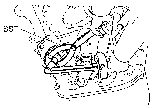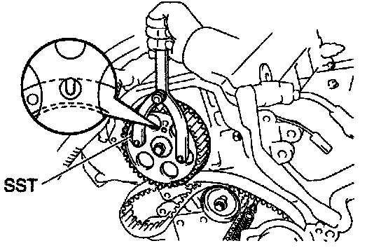 (b) Using SST, turn the camshaft, and align the hole of the camshaft timing pulley with the timing mark of the bearing cap.