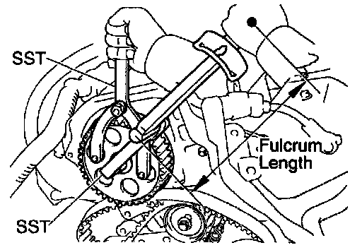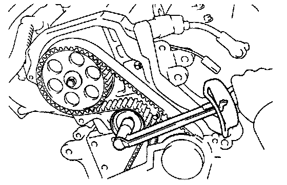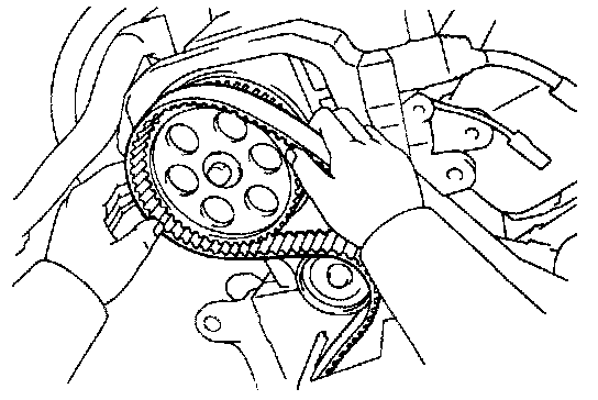(b) Connect the timing belt to the camshaft timing pulley. and checking the tension between the crankshaft timing pulley and camshaft timing pulley.