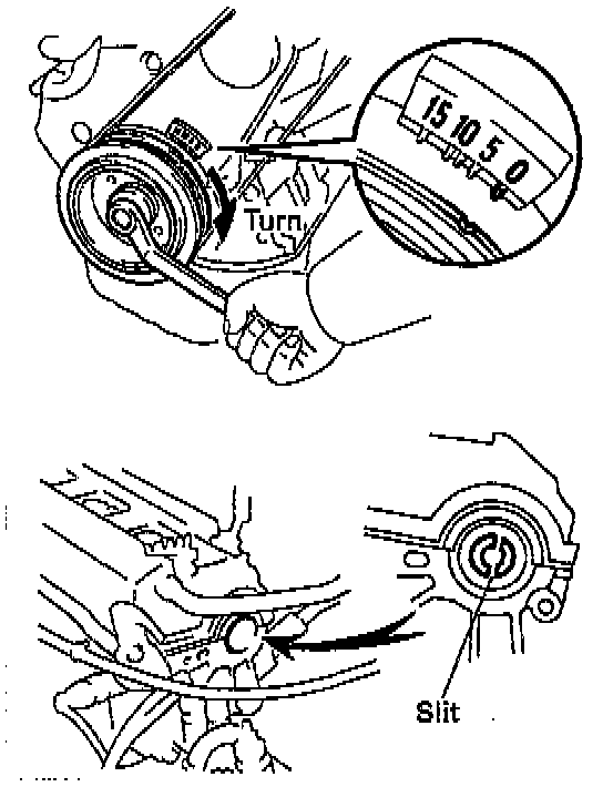 - Turn the crankshaft clockwise, and position the slit of the intake camshaft as shown in the illustration.