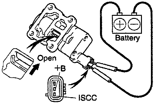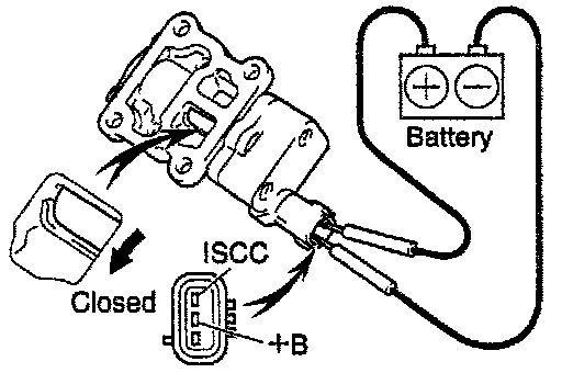 - Connect the positive (+) lead from the battery to terminal +B and negative (-) lead to terminal ISCC, and check that the valve is closed.