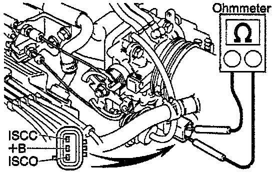 - Using an ohmmeter, measure the resistance between terminal +B and other terminals (ISCC, ISCO).