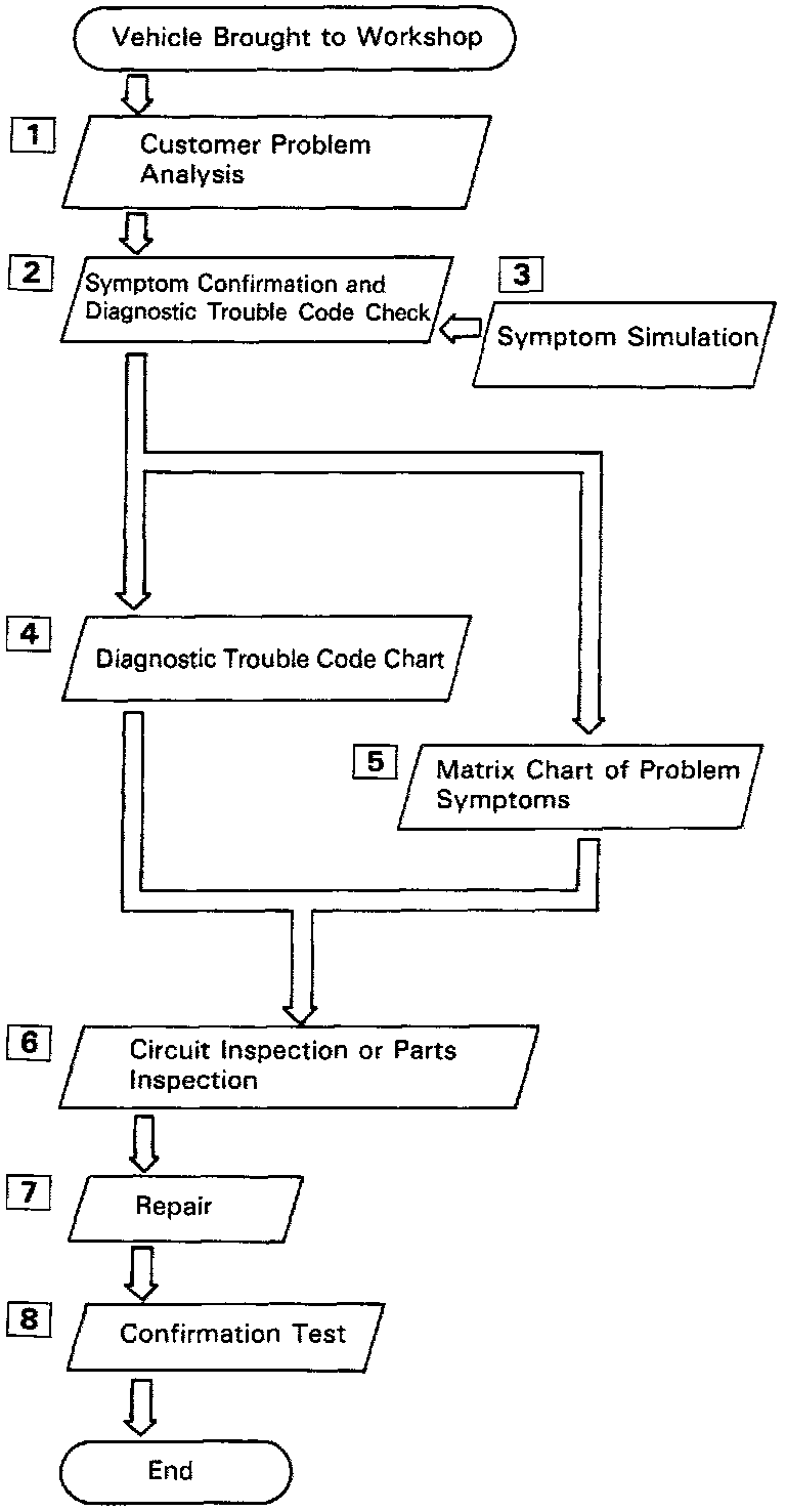 Taking into account the above points, a flow chart showing how to proceed with troubleshooting using the diagnostic trouble code check is shown below. This flow chart shows how to utilize the diagnostic trouble code check effectively, then by carefully checking the results, indicates how to proceed either to diagnostic trouble code troubleshooting or to troubleshooting of problem symptoms.