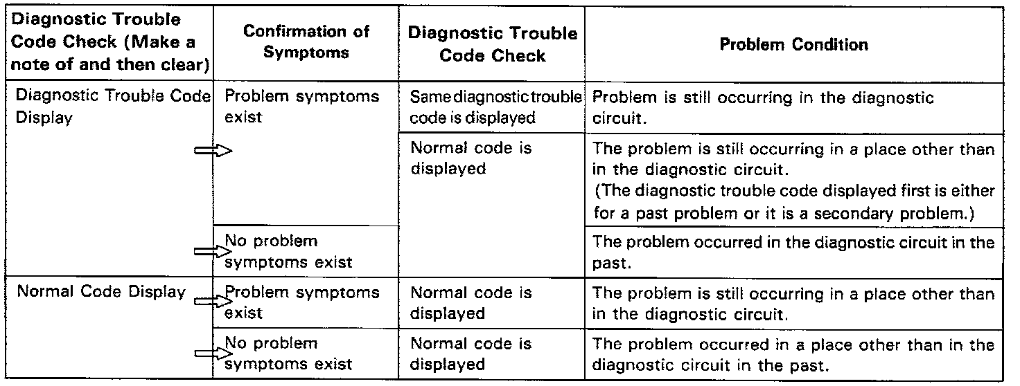 In diagnostic trouble code check, it is very important to determine whether the problem indicated by the diagnostic trouble code is still occurring or occurred in the past but returned to normal at present. In addition, it must be checked in the problem symptom check whether the malfunction indicated by the diagnostic trouble code is directly related to the problem symptom or not. For this reason, the diagnostic trouble codes should be checked before and after the symptom confirmation to determine the current conditions, as shown in the table below. If this is not done, it may depending on the case, result in unnecessary troubleshooting for normally operating systems, thus making it more difficult to locate the problem, or in repairs not pertinent to the problem. Therefore, always follow the procedure in correct order and perform the diagnostic trouble code check.