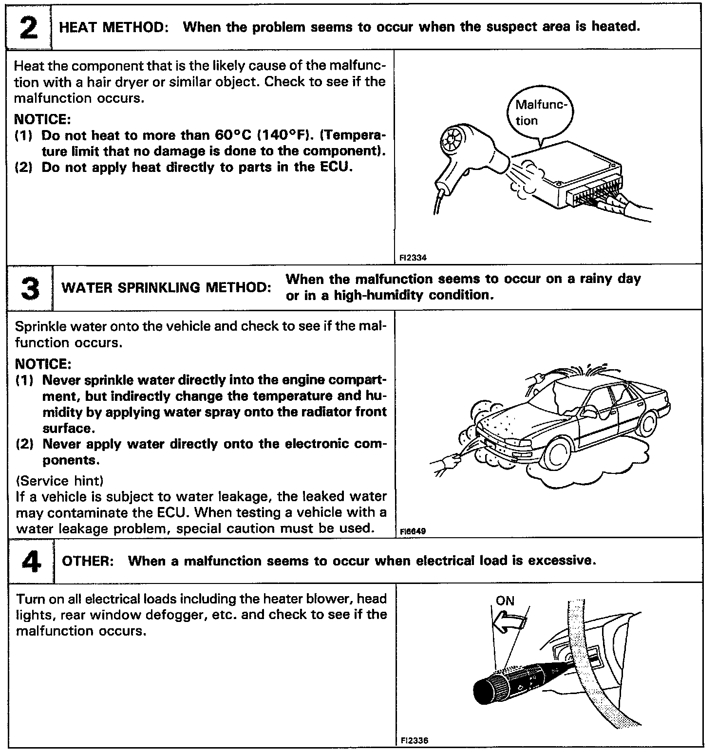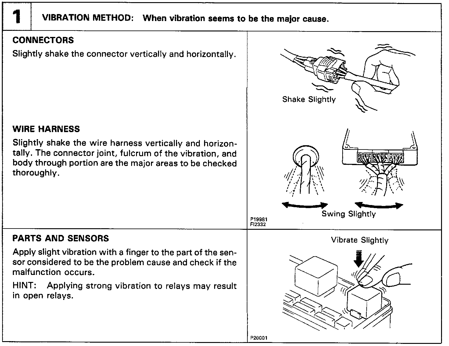 The most difficult case in troubleshooting is when there are no problem symptoms occurring. In such cases, a thorough customer problem analysis must be carried out, then simulate the same or similar conditions and environment in which the problem occurred in the customer's vehicle. No matter how much experience a technician has, or how skilled he may be, if he proceeds to troubleshoot without confirming the problem symptoms he will tend to overlook something important in the repair operation and make a wrong guess somewhere, which will only lead to a standstill. For example, for a problem which only occurs when the engine is cold, or for a problem which occurs due to vibration caused by the road during driving, etc., the problem can never be determined so long as the symptoms are confirmed with the engine hot condition or the vehicle at a standstill. Since vibration, heat or water penetration (moisture) are likely causes for problems which are difficult to reproduce, the symptom simulation tests introduced here are effective measures in that the external causes are applied to the vehicle in a stopped condition.