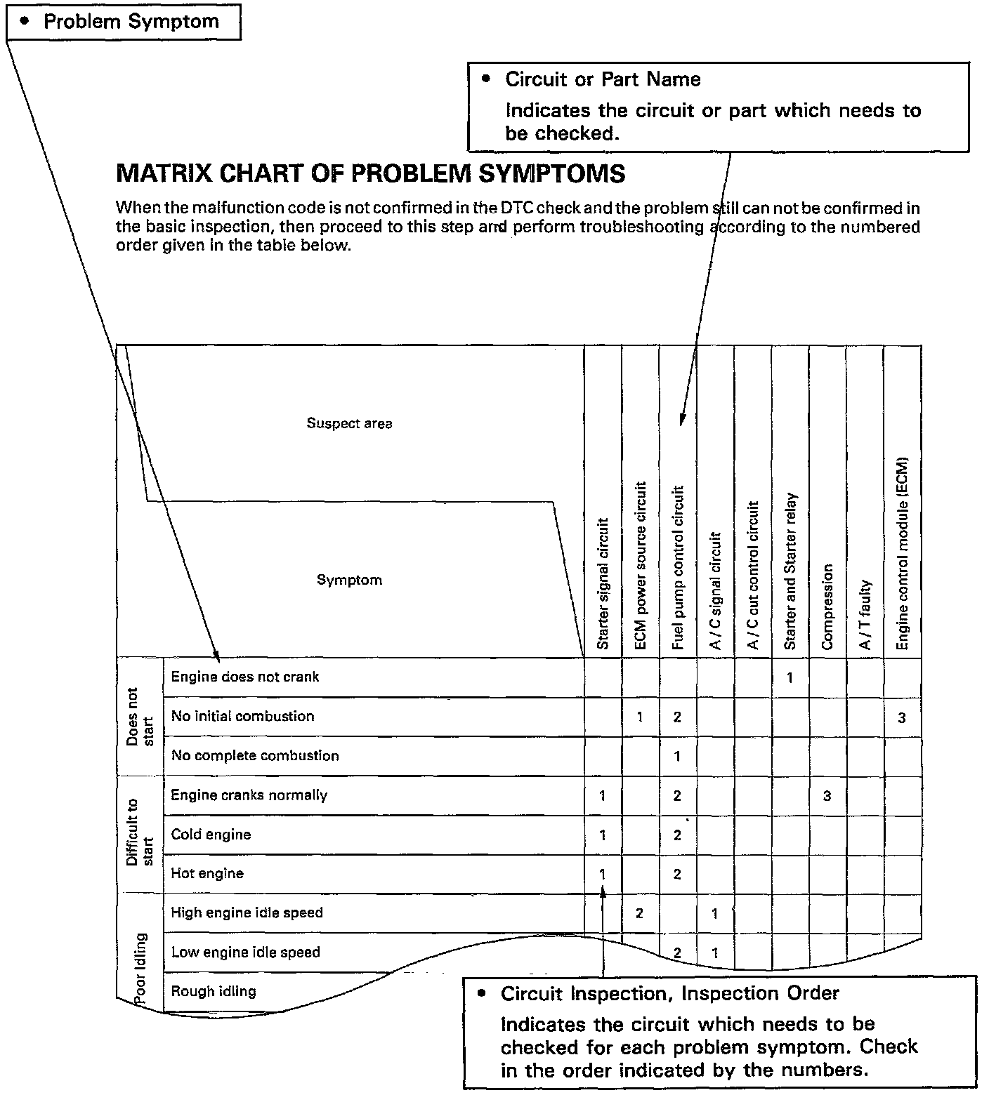 The suspect circuits or parts for each problem symptom are shown in the table below. Use this table to troubleshoot the problem when a "Normal" code is displayed in the diagnostic trouble code check but the problem is still occurring. Numbers in the table indicate the inspection order in which the circuits or parts should be checked.
