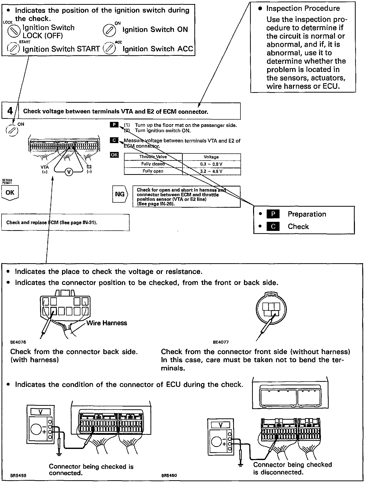 In the symptom simulation test, the problem symptoms should of course be confirmed, but the problem area or parts must also be found out. To do this, narrow down the possible problem circuits according to the symptoms before starting this test and connect a tester beforehand. After that, carry out the symptom simulation test, judging whether the circuit being tested is defective or normal and also confirming the problem symptoms at the same time. Refer to the matrix chart of problem symptoms for each system to narrow down the possible causes of the symptom.
