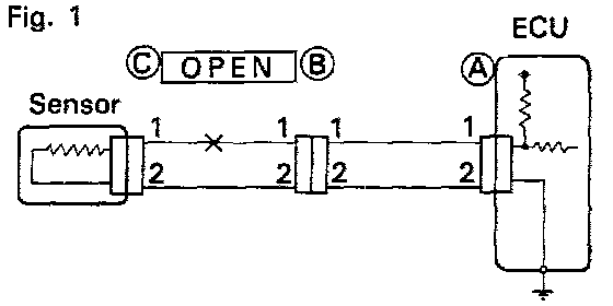 For the open circuit in the wire harness in Fig. 1, perform "(a) Continuity Check" or "(b) Voltage Check" to locate the section.