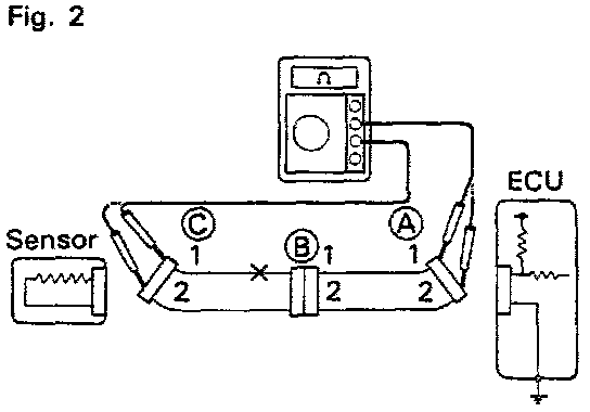(2) Disconnect connector B and measure the resistance between connectors A and B, B and C
