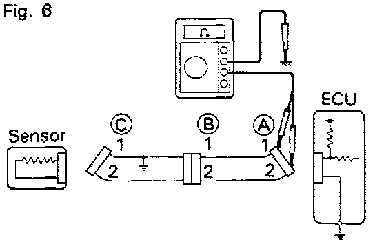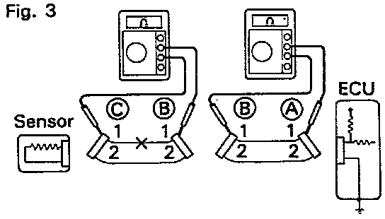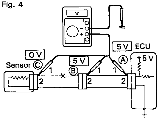(1) As shown in Fig. 4, with each connector still connected, measure the voltage between body ground and terminal 1 of connector A at the ECU 5 V output terminal, terminal 1 of connector B, and terminal 1 of connector C in that order.