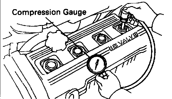 (e) If the cylinder compression in one or more cylinders is low, pour a small amount of engine oil into the cylinder through the spark plug hole and repeat steps (a) through (c) for cylinders with low compression.
