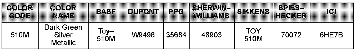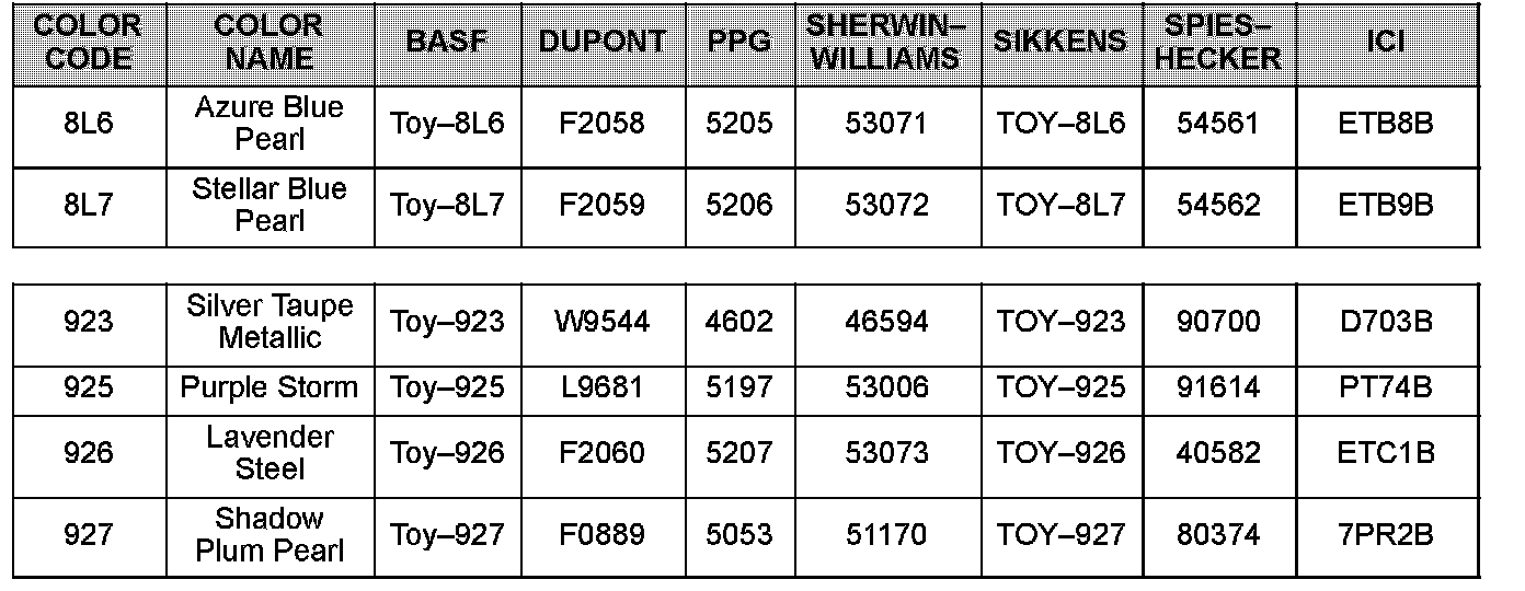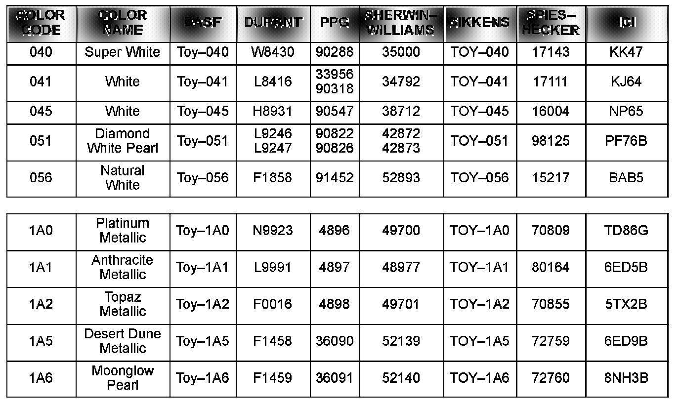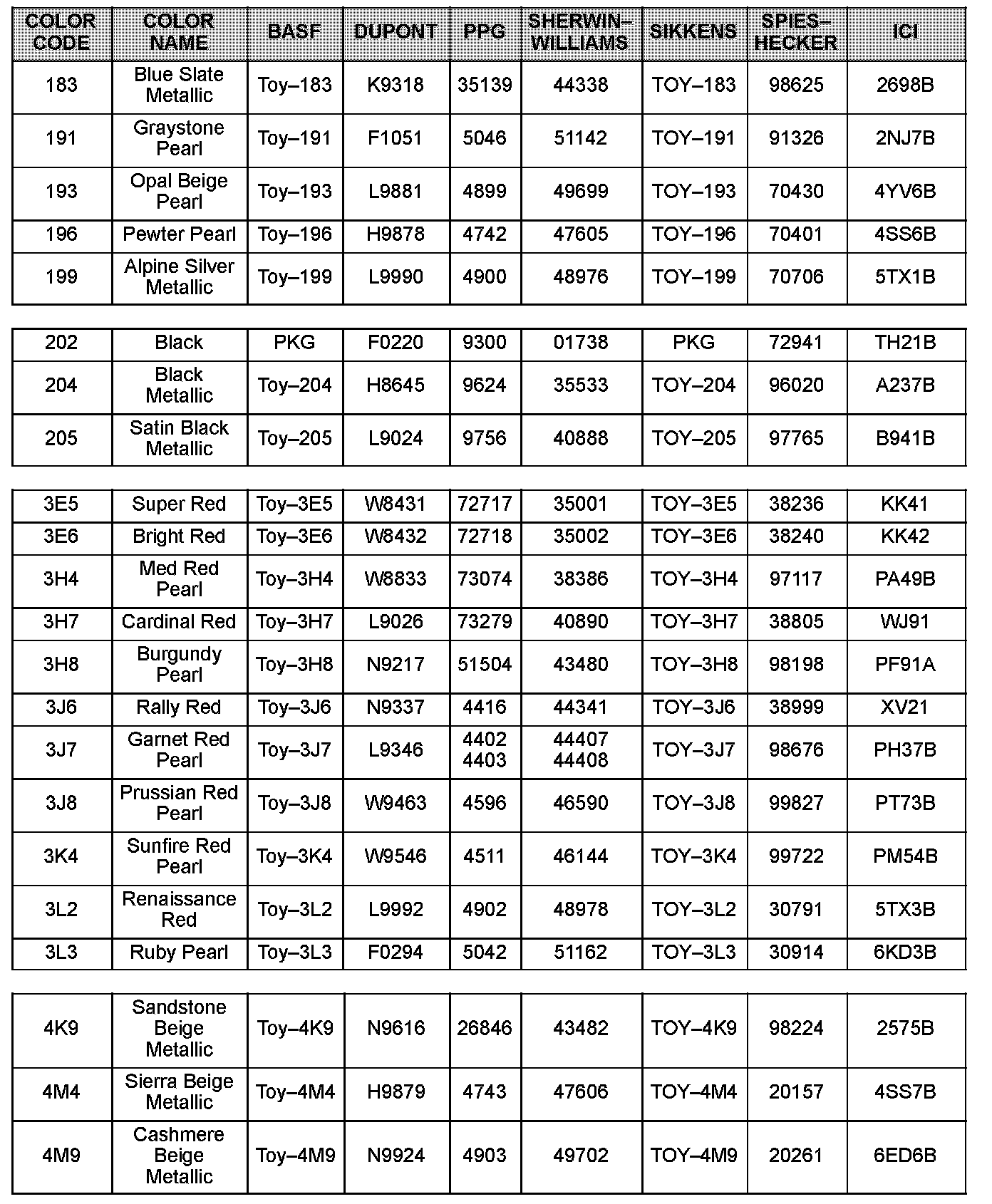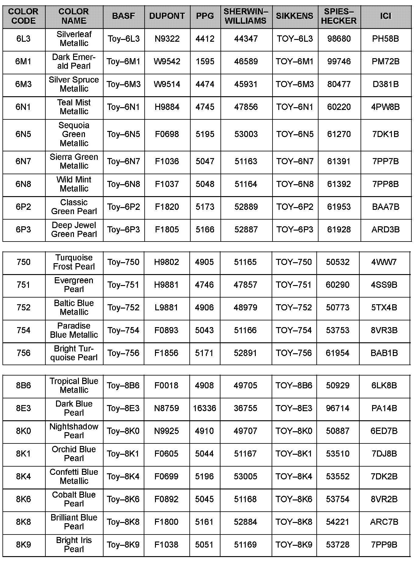 1996 TOYOTA PAINT CODES AND COLOR NAMES