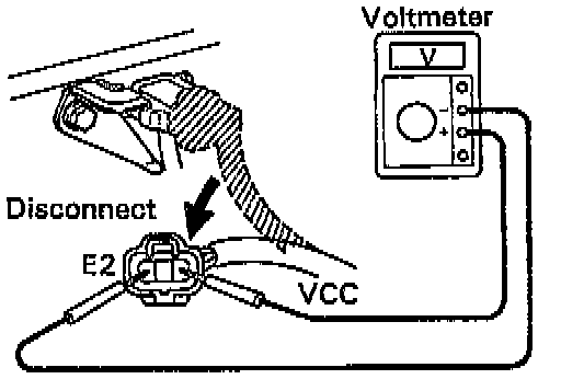 - Using a voltmeter, measure the voltage between connector terminals VC and E2 of the wiring harness side.