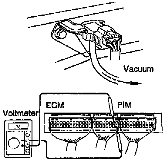 - Connect a voltmeter to terminals PIM and E2 of the ECM, and measure the output voltage under ambient atmospheric pressure.