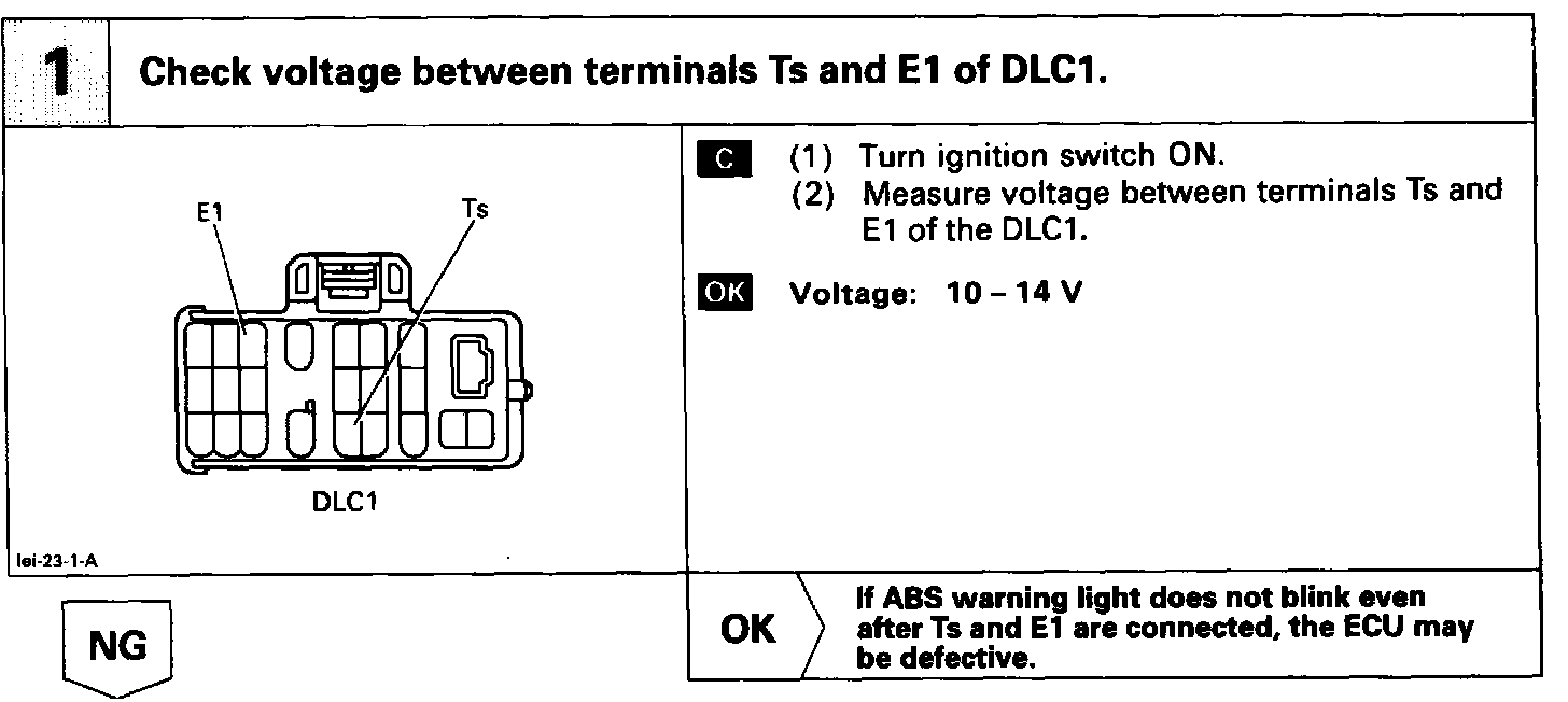 Connecting terminals Ts and E1 of the DLC1 in the engine compartment starts the check.