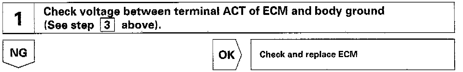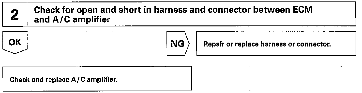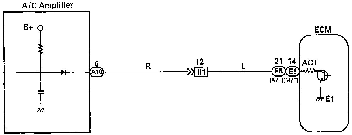 This circuit cuts air conditioning operation during vehicle acceleration in order to increase acceleration performance. During acceleration with the vehicle speed at 25 km/h (16 mph) or less, engine speed at 1,200 rpm or less and throttle valve opening angle at 50 ° or more, the A/C magnet switch is turned OFF for several seconds.