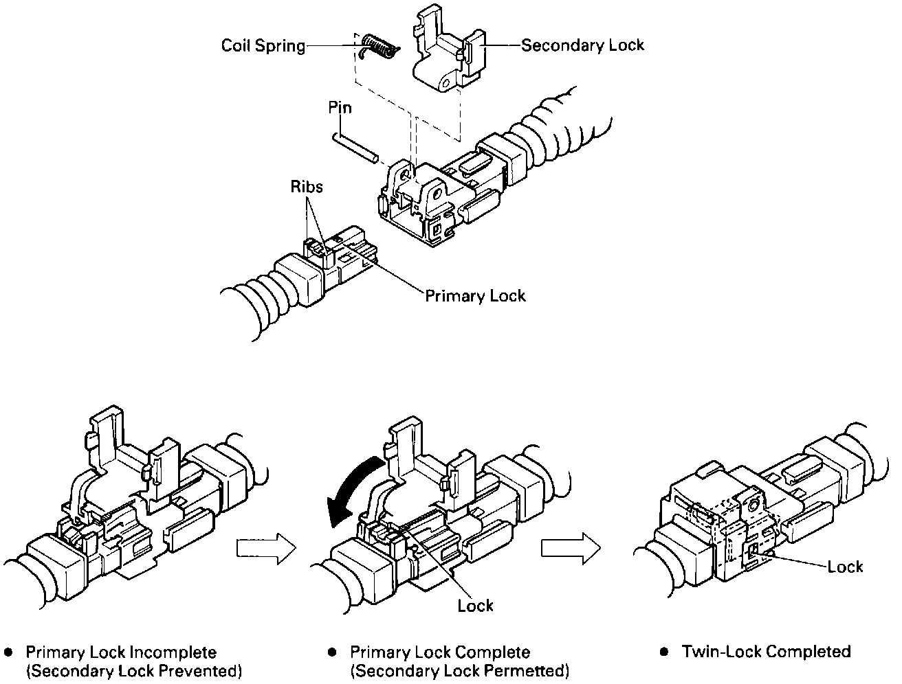 With this mechanism connectors (male and female connectors) are locked by two locking devices to increase connection reliability. If the primary lock is incomplete, ribs interfere and prevent the secondary lock.